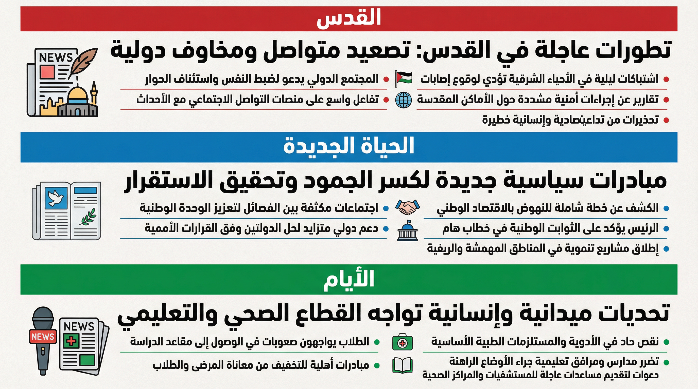 في مشهد إعلامي يعكس نبض الشارع الفلسطيني وتطورات الساحة المحلية والإقليمية، تصدّرت القضايا السياسية والاقتصادية والأمنية عناوين الصحف الفلسطينية الصادرة اليوم. وتناولت الصحف أبرز المستجدات على صعيد الأوضاع الميدانية، إلى جانب تحليلات معمّقة حول التحديات الاقتصادية وتأثيرها على حياة المواطنين، فضلاً عن متابعة الشأن الدولي وانعكاساته على القضية الفلسطينية. في هذا التقرير، نستعرض لكم أهم ما جاء في عناوين الصحف الفلسطينية لهذا اليوم.